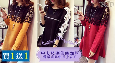 只要558元(含運)即可享有原價1,580元中大尺碼蕾絲加厚保暖寬鬆中長上衣裙,買1送1!多色多尺寸任選?